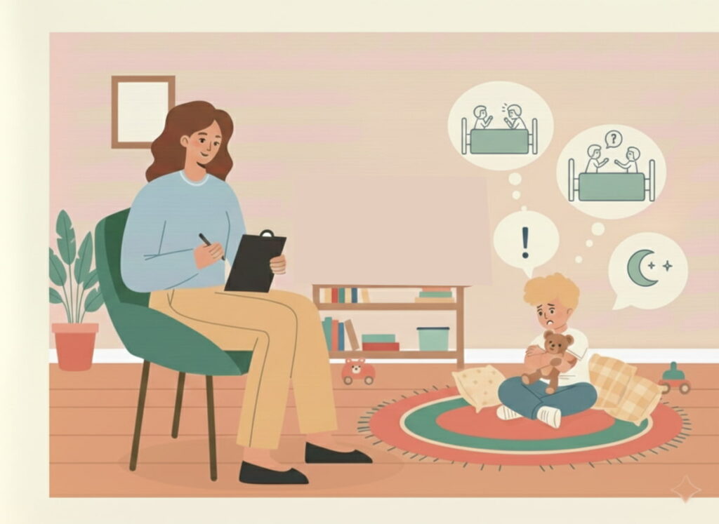 Terapie pentru copii care se confruntă cu tulburări de somn (coșmaruri frecvente, teama de a dormi singuri, treziri nocturne pe fond emoțional).